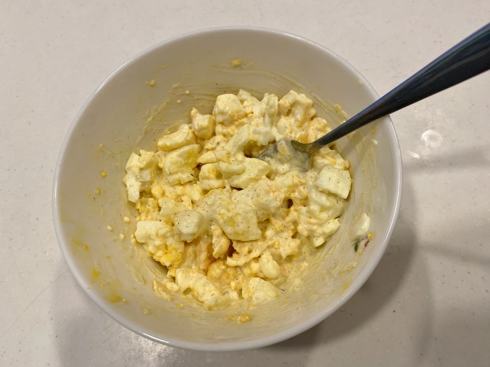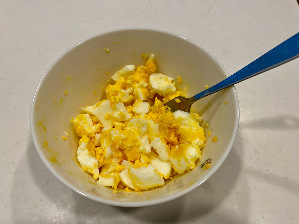 1.ゆで卵2個の殻を剝き、フォークを使って細かく潰す