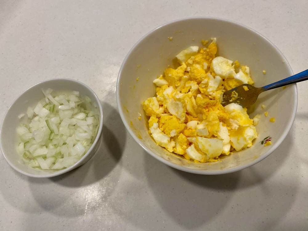 1.玉ねぎ1/2個をみじん切りにして、ゆで卵2個はフォークで細かく潰す