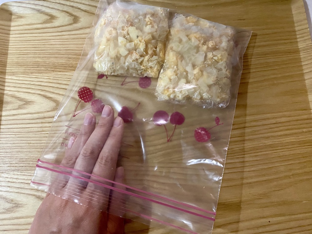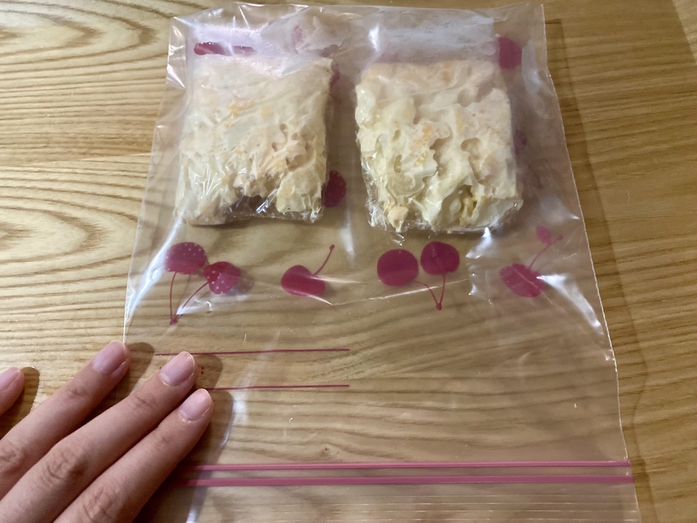 3.1回で使い切る分量に分けてラップで包み、さらに冷凍用保存袋に入れて冷凍する
