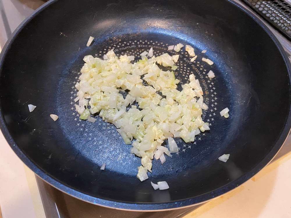 2.フライパンにマヨネーズ大さじ1とみじん切りにした玉ねぎを入れ、水分が飛ぶまで炒める