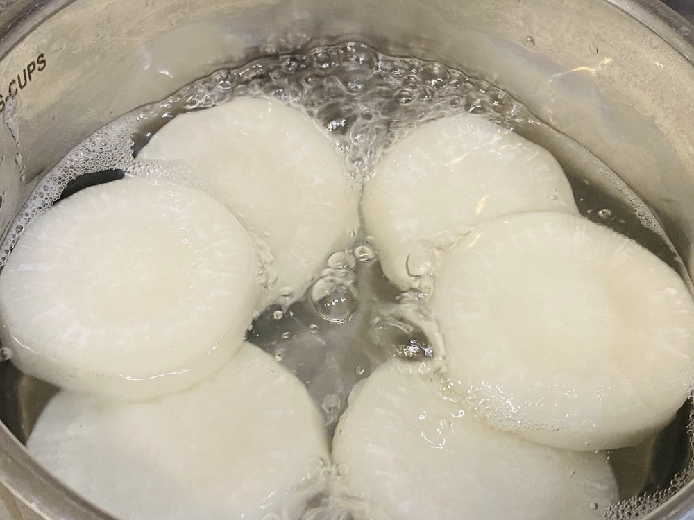 3.鍋に大根、大根が浸かるくらいの水、ひとつまみの塩を入れ、中火にかけ大根に透明感が出るまで茹でる