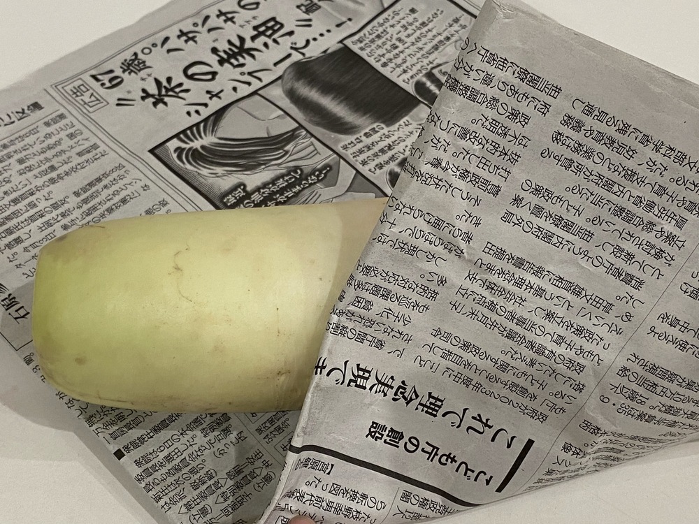 丸ごと1本の大根は、そのまま野菜室に入れると野菜の水分が失われて乾燥しやすいため、必ず新聞紙やキッチンペーパーなどで包み適度な湿度を保ってください。ラップで包む方法もありますが、新聞紙などの紙類よりも通気性が非常に悪く、冷蔵庫以外の保存方法だとカビが生えてしまう可能性があるので注意しましょう。