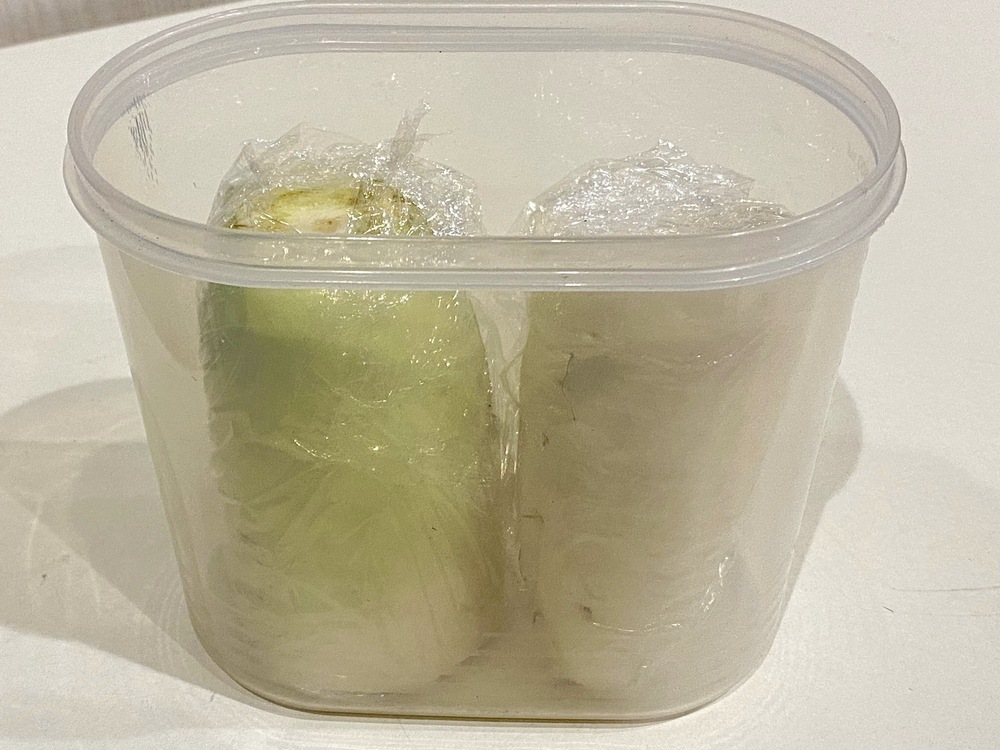 切った大根や使いかけの大根は、切り口から水分が失われて乾燥すると食感が悪くなります。半分に切った大根や残りの大根は、切り口にラップを密着させて空気を遮断してください。ラップで包んだ後に保存袋に入れ、葉のあった方を上にして立てて保存します。