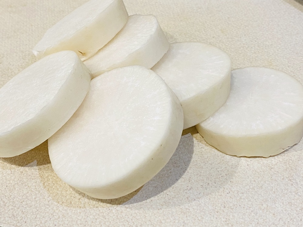 1.大根は皮をむかずに、厚さ約2cmの輪切りにする