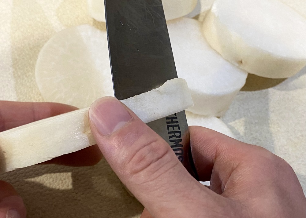 1.大根は皮をむいて1cm角のいちょう切りにする