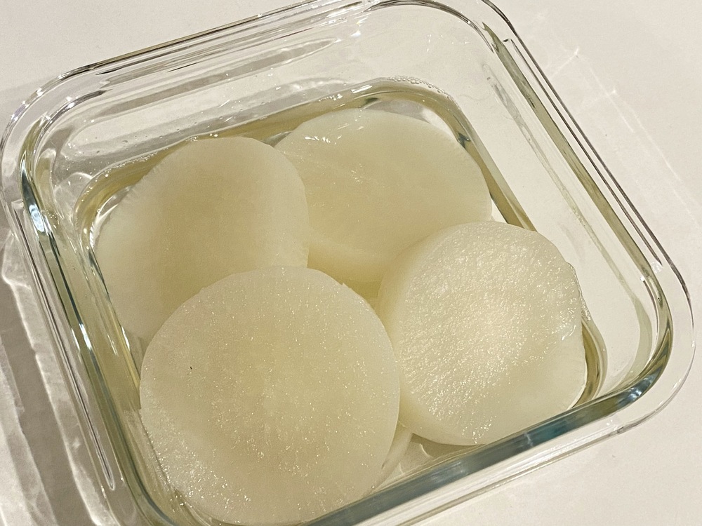 茹でた大根を水につけて冷蔵に入れ、保存期間中は毎日水を交換すれば、3~4日間は日持ちします。水分がにごったり臭いが出たりした場合は、早めに水を交換してください。